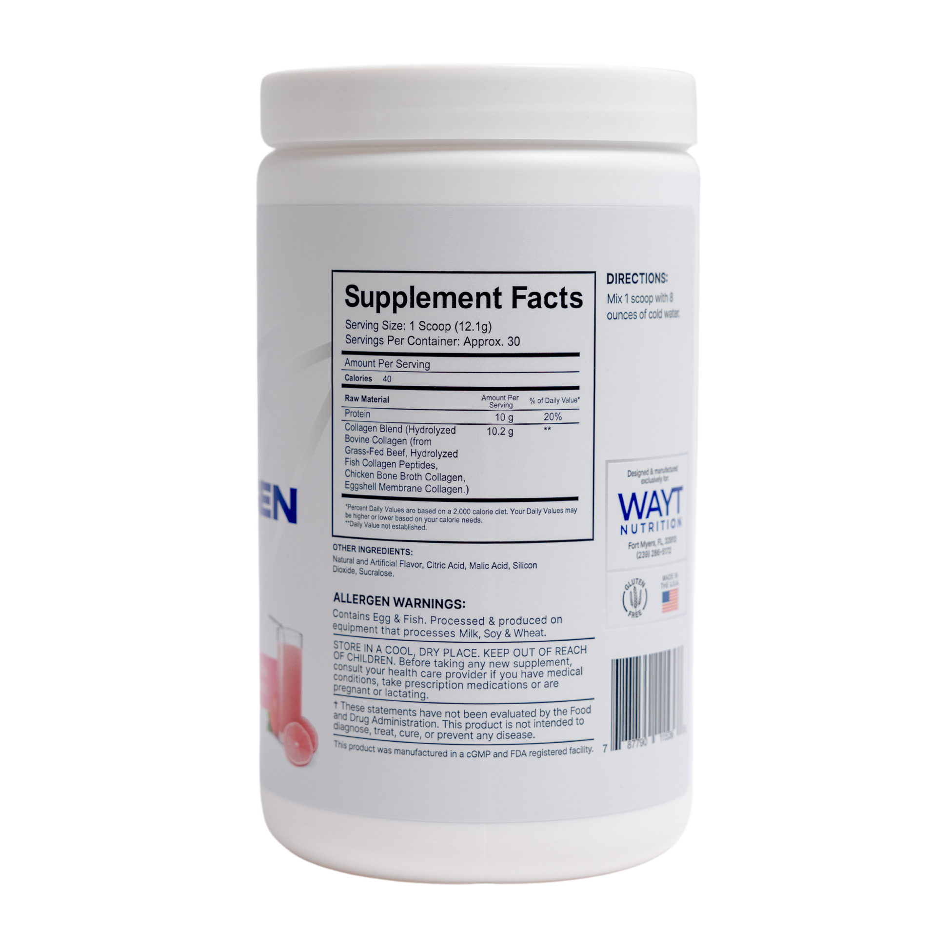 Collagen is an essential protein found throughout our bodies, in everything from our bones, skin, muscles, tendons, ligaments and even corneas and teeth. But as we age, our bodies start to naturally produce less collagen. Help combat time by adding this tasty, easy-mixing and easy-digesting supplement into your regular routine. Collagen protein is known to benefit hair, nails, and joints. Improve skin quality/wrinkles, and even help smooth cellulite. Sourced from grass-fed cows, WAYT Collagen is high in antioxidants and can also help improve your gut biome. See the results yourself as you start to turn back the hands of time with WAYT Collagen.*