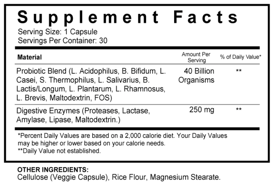 Probiotic: 2 Capsules Per Day with your largest meals and 12-16oz of water.