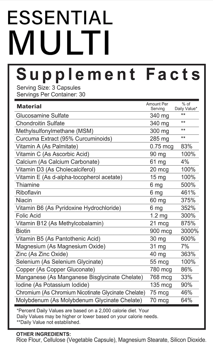 Essential Multi: 3 Capsules Per Day with your first meal.