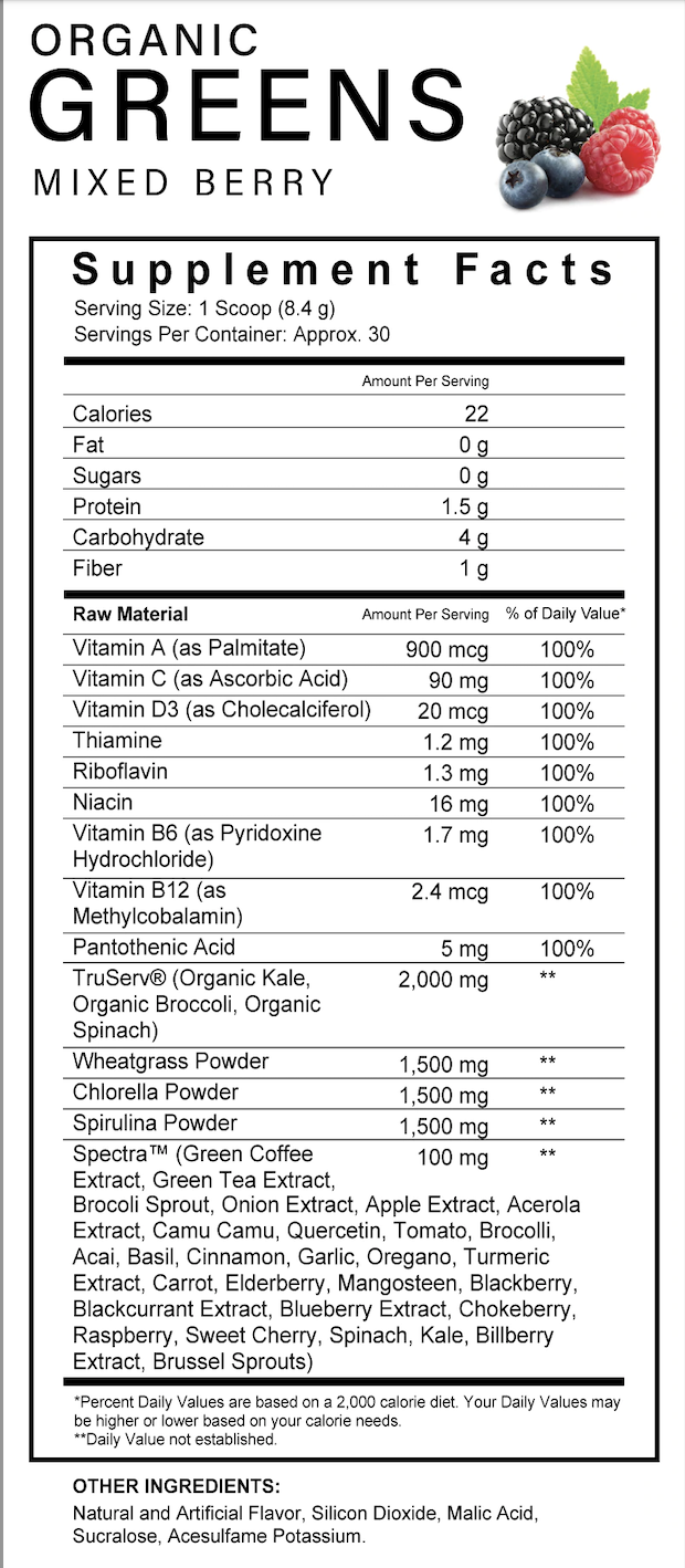 Organic Greens: 1 to 2 Scoops Daily Mixed w/ 8oz of water. (Upon Waking and/or Prior to Sleep)